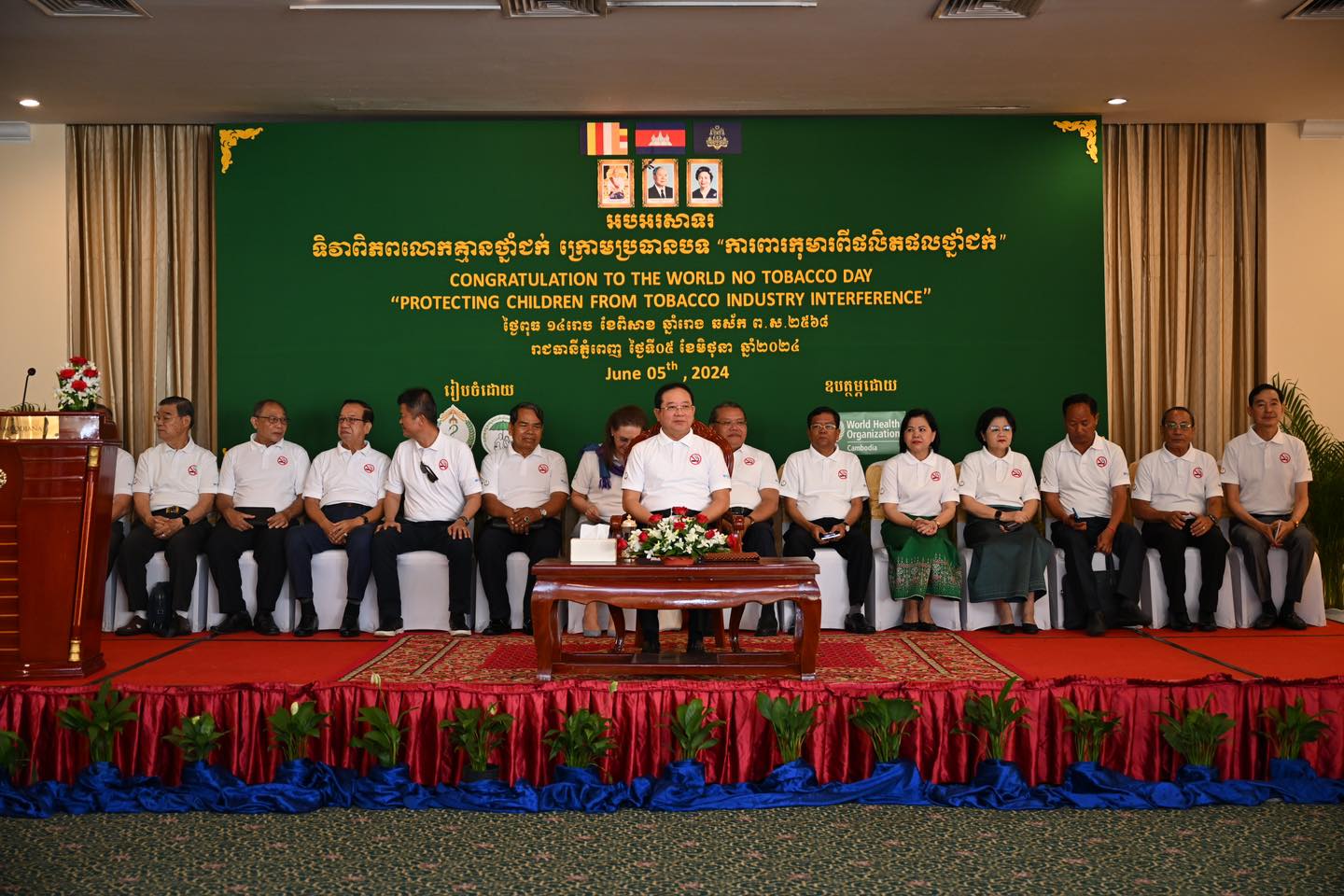 រាជធានីភ្នំពេញ៖ ឯកឧត្តមសាស្រ្តាចារ្យ ឈាង រ៉ា រដ្ឋមន្រ្តីក្រសួងសុខាភិបាល និងជាប្រធានគណៈកម្មាធិការត្រួតពិនិត្យផលិតផលថ្នាំជក់នៅថ្ងៃទី៥ ខែមិថុនា ឆ្នាំ២០២៤ អញ្ជើញជាអធិបតីក្នុងទិវាពិភពលោកគ្មានថ្នាំជក់ ឆ្នាំ២០២៤ ក្រោមប្រធានបទ «ការពារកុមារពីផលិតផលថ្នាំជក់»។